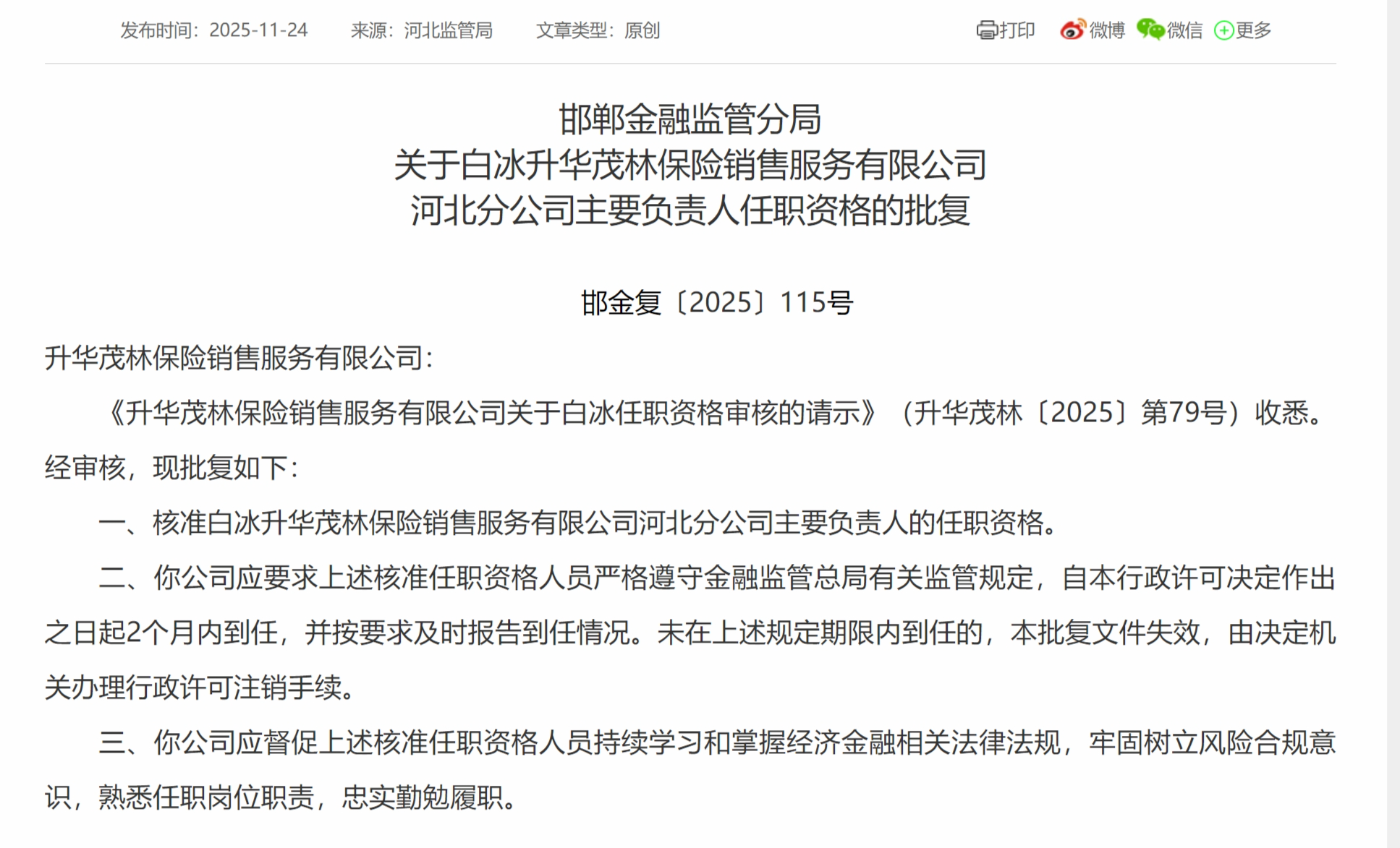 11月24日,邯郸金融监管分局发布《关于白冰升华茂林保险销售服务有限公司河北分公司主要负责人任职资格的批复》,核准白冰升华茂林保险销售服务有限公司河北分公司主要负责人的任职资格。